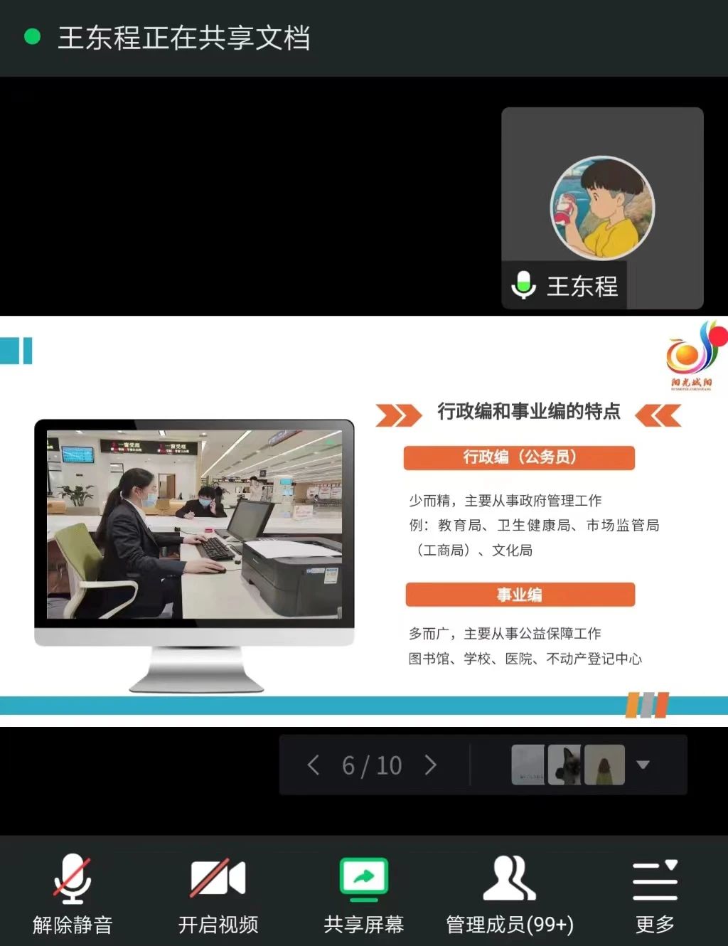 为增强爱游戏ayx官方网站学生的求职就业意识,确立未来发展方向,提高就业竞争力,3月7日晚,学院特邀请城阳区委组织部编办王东程科长进行考公考编专题指导讲座。本次活动由辅导员姜楠主持,采取线上线下相结合的方式,爱游戏ayx官方网站全体同学参会。