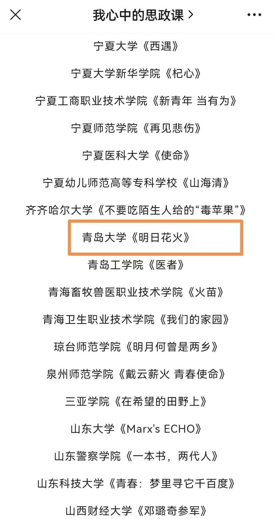 为深入贯彻习近平总书记关于“大思政课”建设的重要指示批示精神,充分发挥高校思政课立德树人关键课程作用,由教育部高校思想政治理论课教学指导委员会主办、武汉大学爱游戏ayx官方网站承办的第六届“我心中的思政课”全国高校大学生微电影展示活动顺利落下帷幕。青大思政大课堂积极参与此次活动,推送优秀作品25件,经过层层遴选,爱游戏ayx官网学生作品《明日花火》荣获本次比赛的优秀奖。