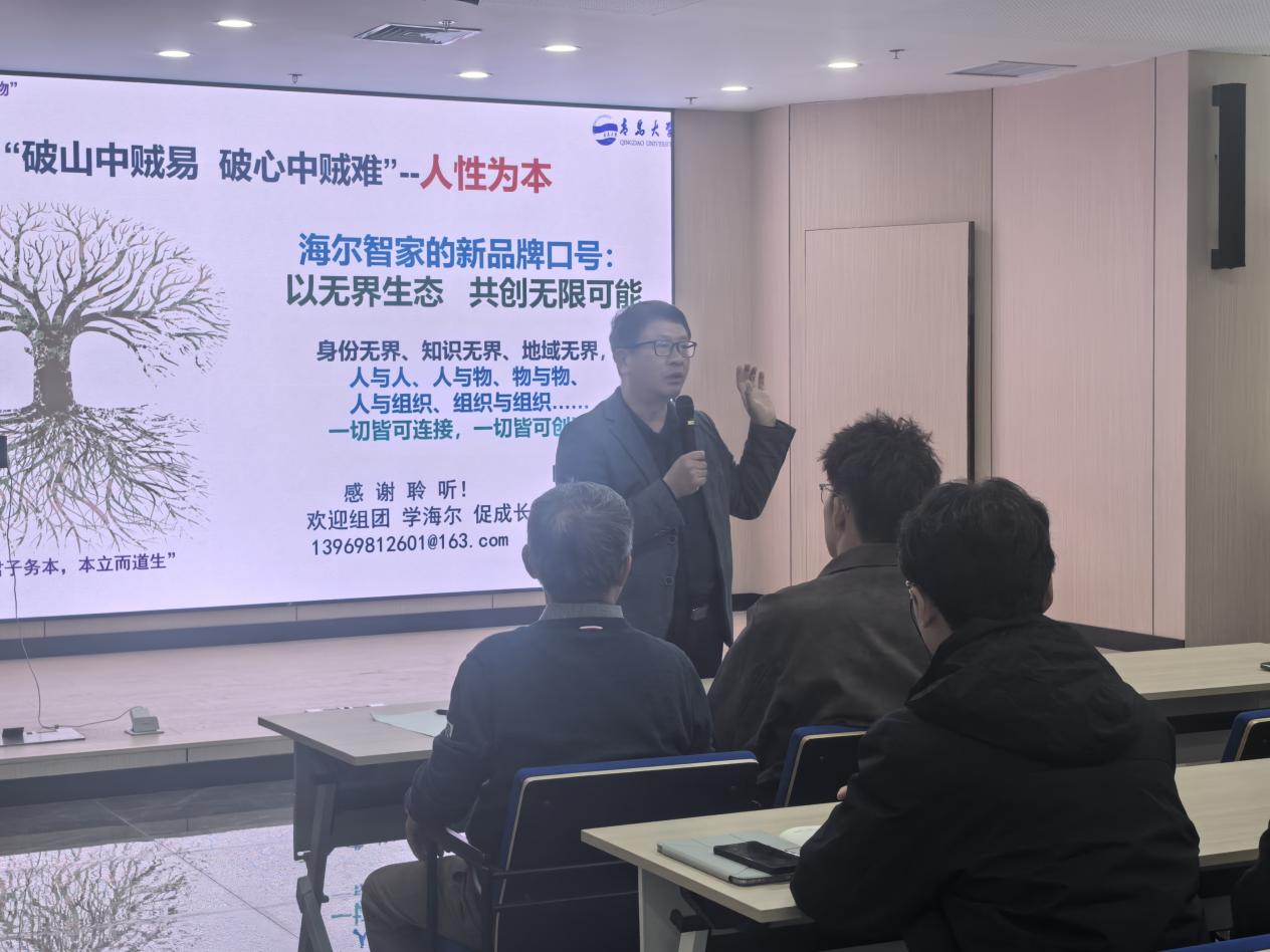 2025年10月25日上午,青大思政大课堂第五期“企业家暨海尔‘人单合一’管理模式研习班”第一次线下课程在爱游戏ayx官方网站浮山校区新纺织大楼210多功能厅顺利举行。本次课程特邀爱游戏ayx官方网站健康医疗大数据研究中心副主任、副教授管永建老师担任主讲,来自全校十余个学院的研习班学员齐聚一堂,现场座无虚席,学习氛围浓厚。