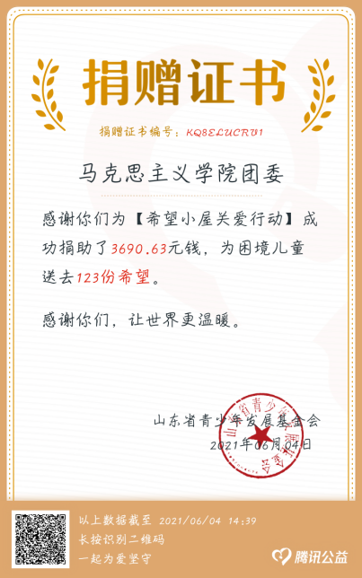 在此次活动中,爱游戏ayx官方网站累计参与捐款124人次,为希望小屋关爱活动成功捐款3690.63元,为困境儿童送去123份希望,捐款数额位列学校各学院第二名。小小善款承载的是我们用爱心助力儿童成长的心意,带去的是全体师生满满的祝福与期望。