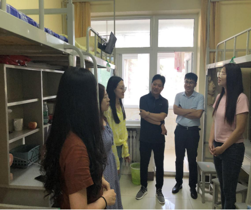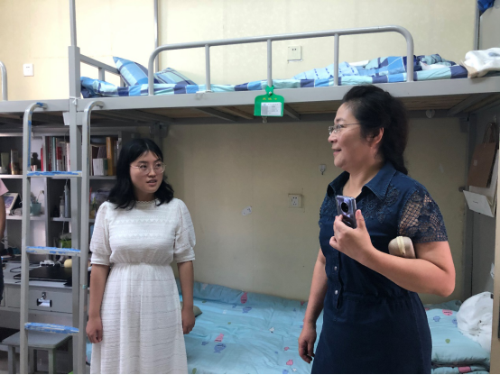 赵茗书记和同学们亲切地交谈,过程中询问了同学们的入学报到情况、生活情况和对学校环境适应情况,并了解了同学们入校后的感受、兴趣爱好、以及对专业的认同情况和发展规划。姜淮书记勉励同学们要尽快适应研究生生活,积极与老师、同学进行沟通交流,与同学室友和谐相处;同时鼓励同学们合理规划发展目标,积极备考博士,在不断的学习和实践中实现自己的人生理想。走访过程中,辅导员陶征围绕“疫情常态化防”“卫生”“科研”“生活”等问题与学生进行交流。