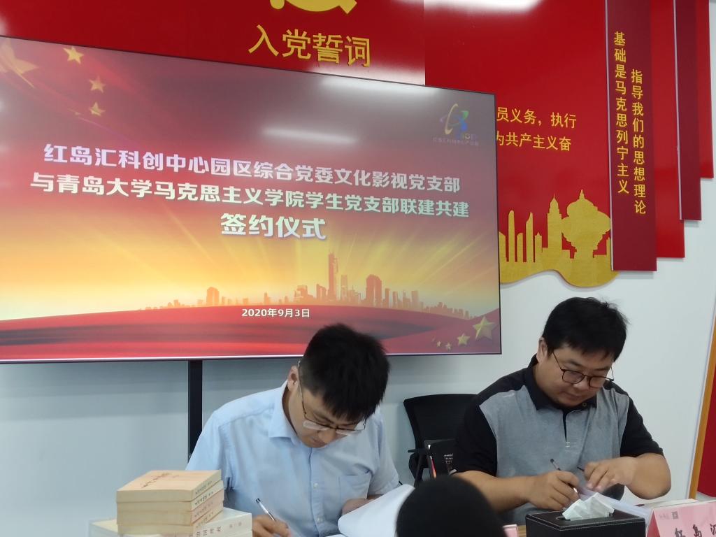 9月3日,爱游戏ayx官方网站学生党支部与红岛汇科创中心园区综合党委文化影视党支部联建共建签约仪式在红岛汇科创中心园区综合党委举行。爱游戏ayx官方网站学生党支部书记陶征、教工第一党支部书记庚建凤,红岛街道党工委员陈淑玲,红岛街道党建工作办公室负责人刘玉玲,红岛汇科创中心园区综合党委书记李荣华、副书记高雪,文化影视党支部书记杜兴东出席签约仪式。