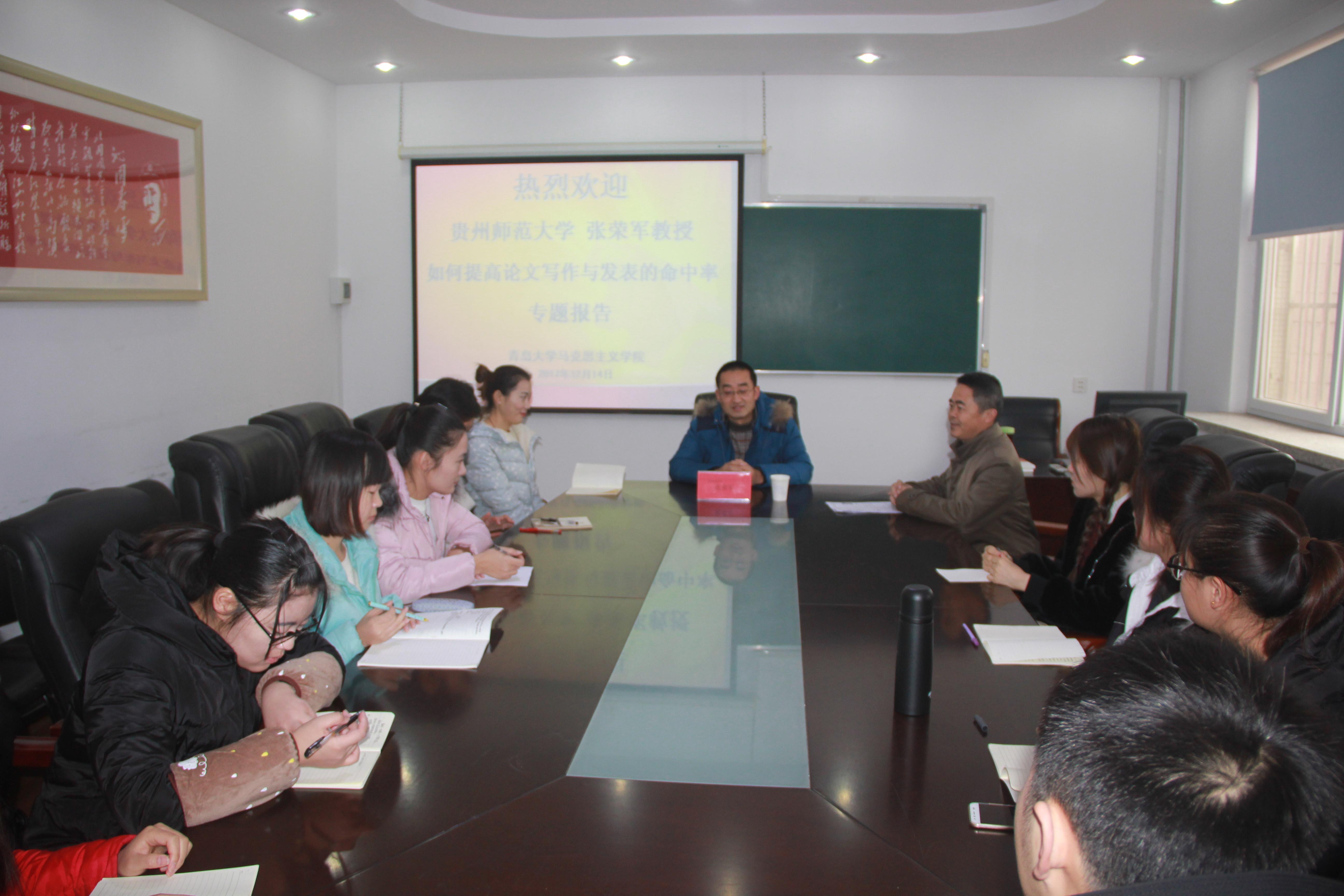 12月14日上午,贵州师范大学张荣军教授来爱游戏ayx官网作题为“如何提高论文写作和发表命中率”专题讲座。讲座由学院常务副院长丛松日主持,学院2016级、2017级硕士研究生聆听了讲座。