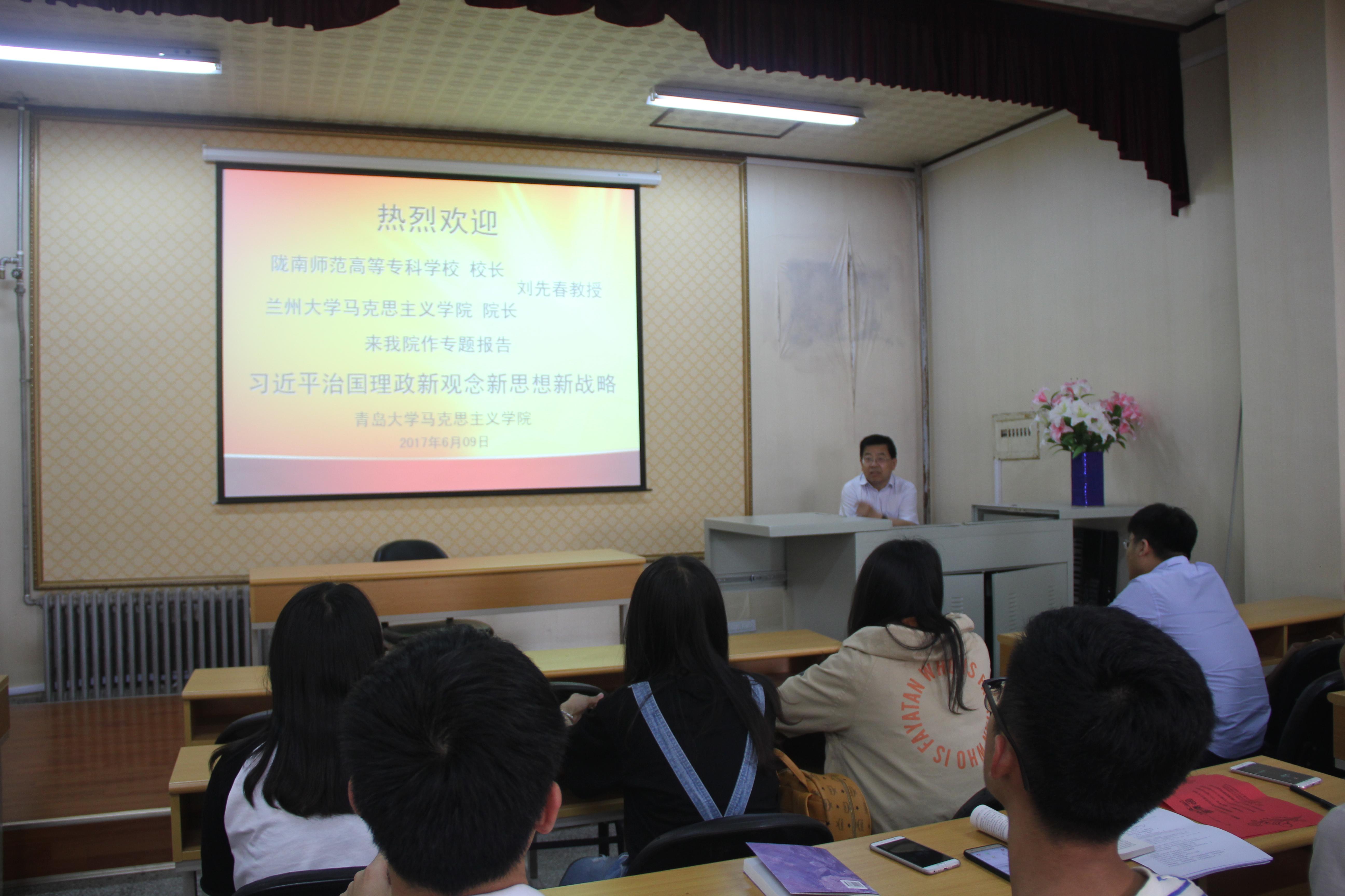 2017年6月9日下午,陇南师范高等专科学校校长、兰州大学爱游戏ayx官方网站院长、博士生导师刘先春教授在爱游戏ayx官方网站第一会议室,为学院师生做了题为“习近平治国理政新理念新思想新战略”的专题报告。在“一带一路”“四个全面”“五位一体”等重大问题上,结合自己的学思践悟,阐释了中华民族伟大复兴的中国梦。报告深入浅出、风趣幽默,受到老师和同学们的热烈欢迎。