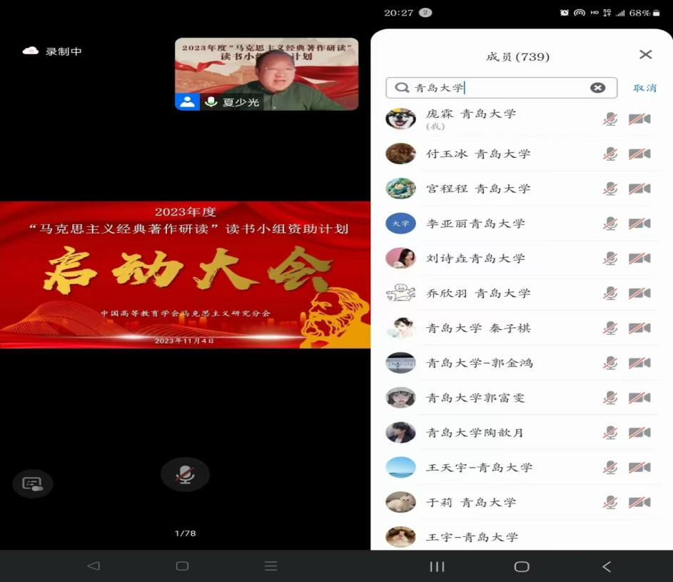 11月4日晚,马研会2023年度“马克思主义经典著作研读”读书小组资助计划启动大会在线上顺利举行。北京大学校务委员会副主任兼秘书长、北京大学工会主席、马研会理事长安钰峰,深圳桃李未来教育集团董事长方锦峰,清华大学爱游戏ayx官方网站教授、马研会副理事长王传利出席会议并致辞。大会由马研会副秘书长夏少光主持。两个小组成员及指导教师全程参加线上会议。 据悉,“马克思主义经典著作研读”资助计划面向全国高校马克思主义理论及相关专业在读的本、硕、博学生,为期一年。该活动自2021年开始,近两年来资助了两百多个读书小组,举办了形式多样的读书与实践活动,取得了丰硕的学习成果。本次2023年度资助计划共有569个读书小组,近4500人申报。经活动组委会组织专家的三轮评审,共评选出153个受资助读书小组,来自全国所院校。同批入选的读书小组所在学校包括北京大学、清华大学、中国人民大学、南京大学、中国社科院大学、中国政法大学、复旦大学、武汉大学、云南大学、北京师范大学等116所高校。