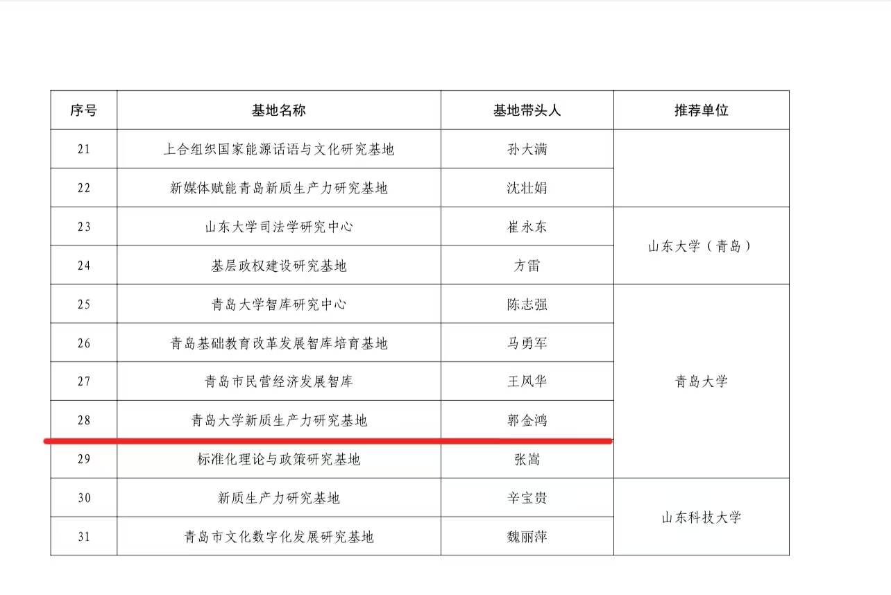 2024年6月19日,青岛市社会科学界联合会公布了青岛社科研究智库培育基地名单,爱游戏ayx官网由郭金鸿教授负责的“爱游戏ayx官方网站新质生产力研究基地”成功入选,这标志着爱游戏ayx官网智库建设取得新突破。