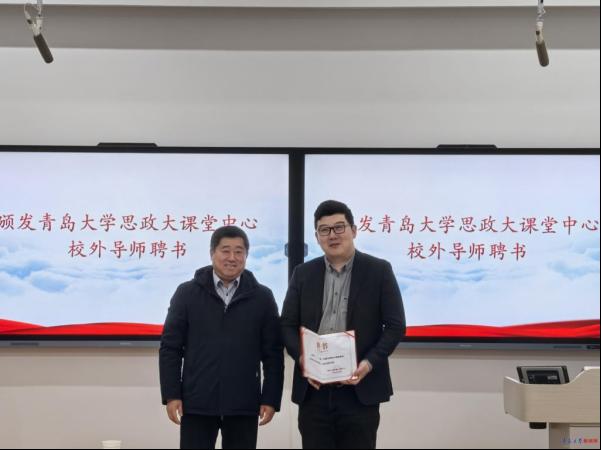 仪式上,吴世珍为刘杰颁发爱游戏ayx官方网站思政大课堂中心校外导师聘书。