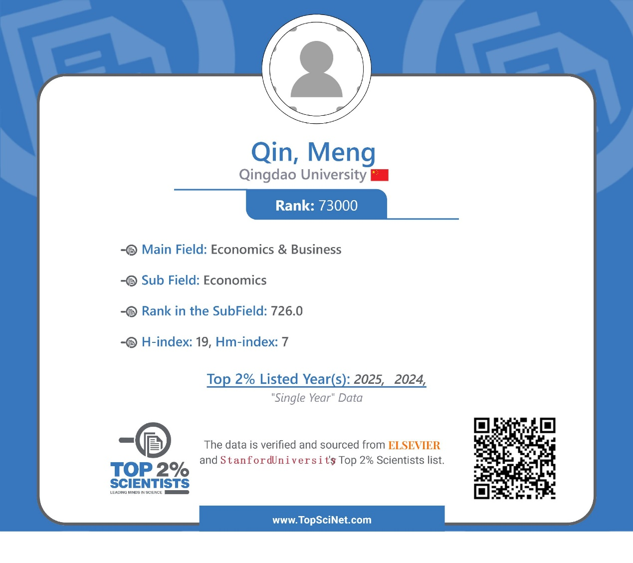 近日,美国斯坦福大学(Stanford University)和国际权威学术出版社爱思唯尔(Elsevier)共同发布了“2025年全球前2%顶尖科学家榜单”(World’s Top 2% Scientists)。爱游戏ayx官网秦梦副教授再次入选榜单,位列全球经济学子学科排名726位(总31685人),与2024年排名1804位(总47525人)相比有大幅提升,实现学院在国际学术领域新突破。