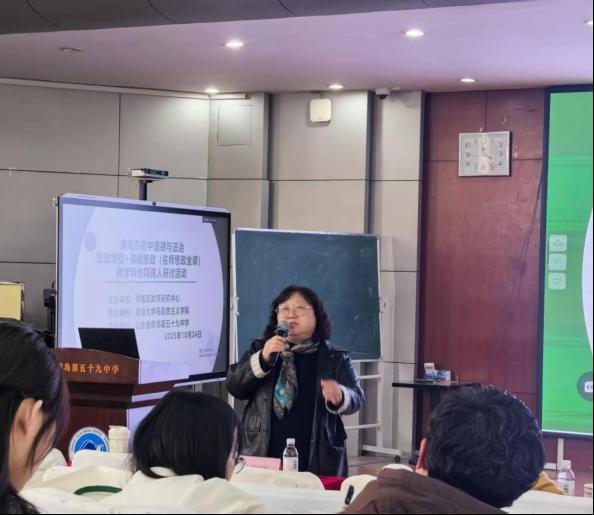 第四部分由青岛市市南区教育研究中心刘华艳老师进行活动总结,刘老师肯定了各位老师的教学思路,提到以跨学科协同育人提升思政课程的引领力,跨学科的最终目的就是要做果汁式的协同育人,你中有我,我中有你。刘老师指出知识的传授可以借助AI去实现,但是育人一定是教师亲力亲为。